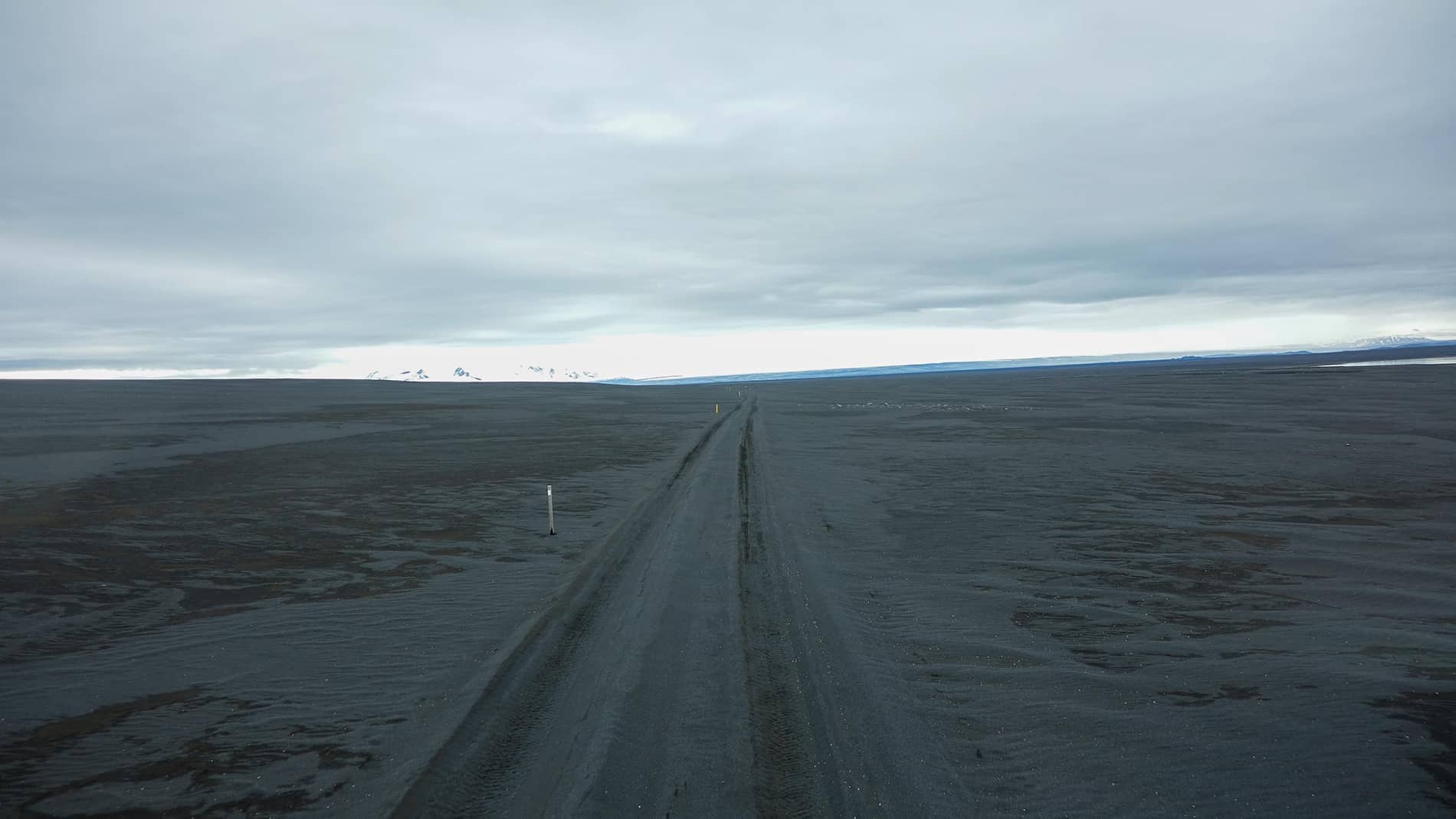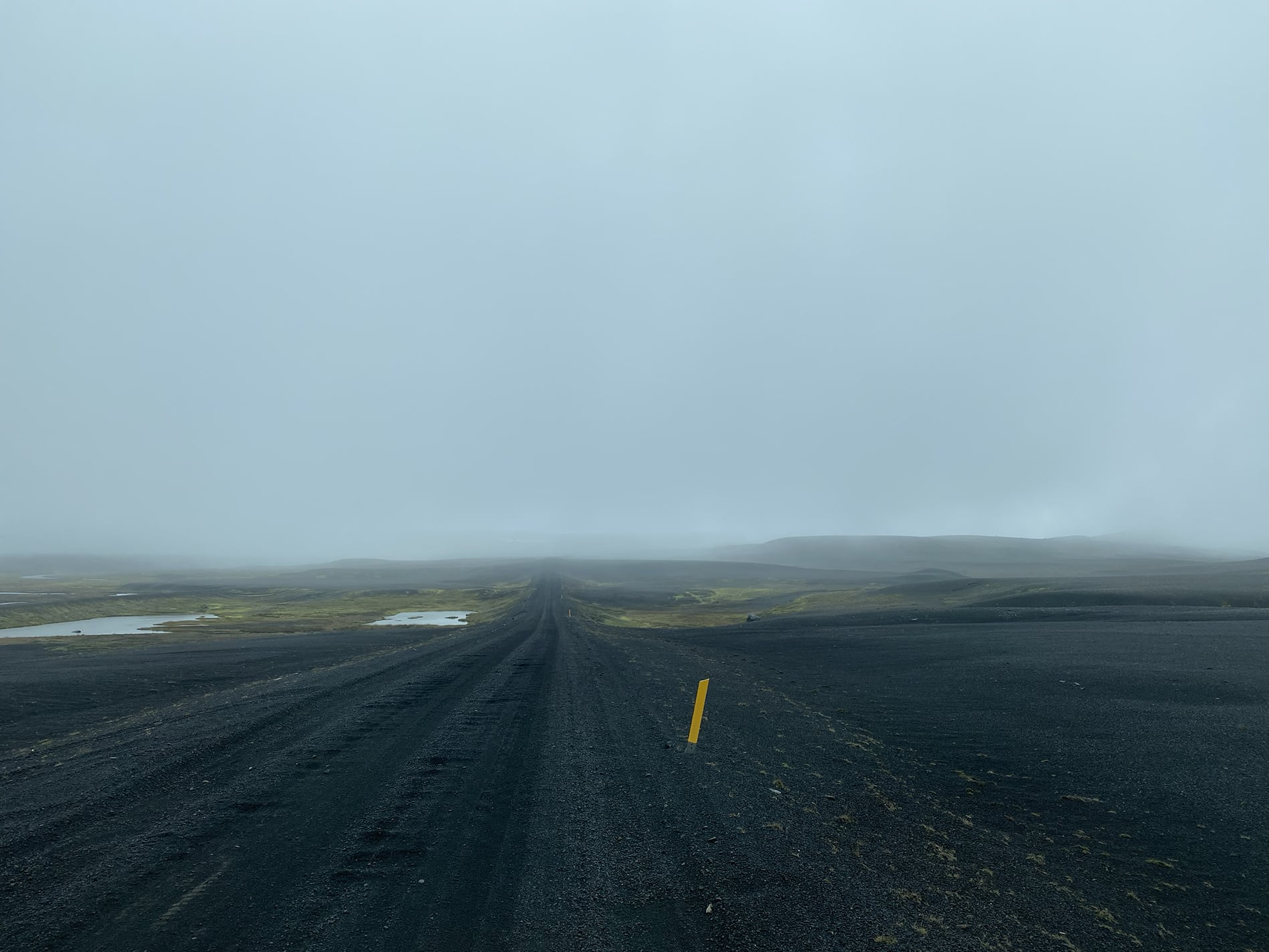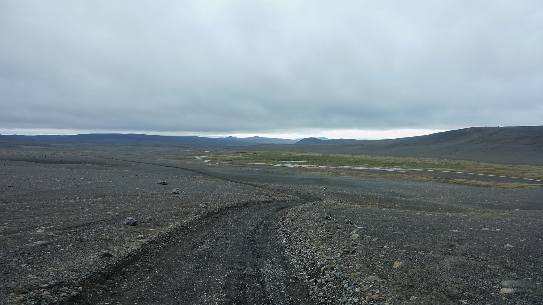 After a stormy night of which we actually experienced very little and a quiet morning, the journey continues along the F26 in a southerly direction. After about 30 kilometers we turn right on an unnumbered track that takes us a few kilometers from the Hofsjรถkull glacier via numerous artificial dikes. Brilliant place, completely in the middle of nowhere, beautiful view of the glacier if not wrapped in the clouds all the time. Clouds with continuous rain.