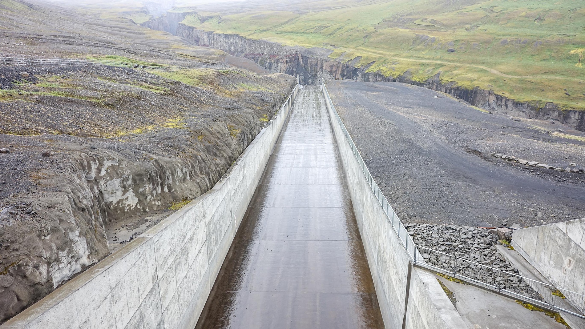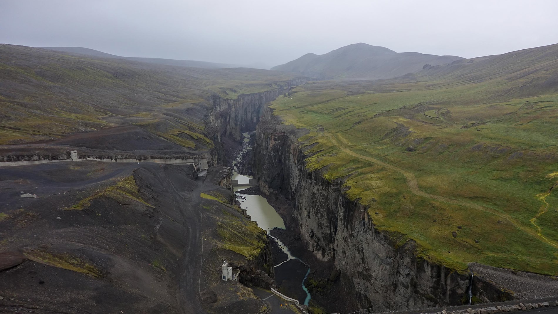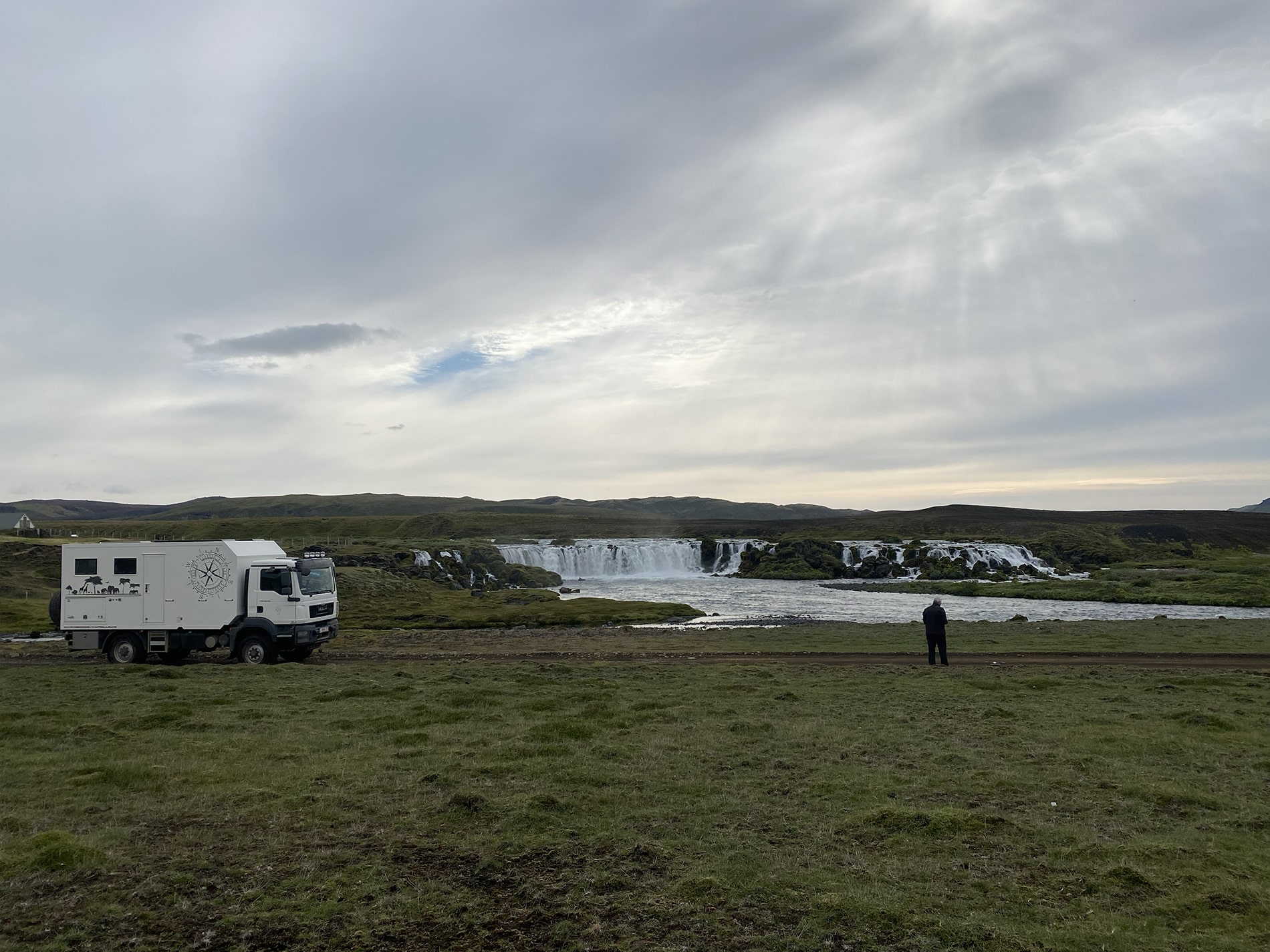 After a stormy night of which we actually experienced very little and a quiet morning, the journey continues along the F26 in a southerly direction. After about 30 kilometers we turn right on an unnumbered track that takes us a few kilometers from the Hofsjรถkull glacier via numerous artificial dikes. Brilliant place, completely in the middle of nowhere, beautiful view of the glacier if not wrapped in the clouds all the time. Clouds with continuous rain.