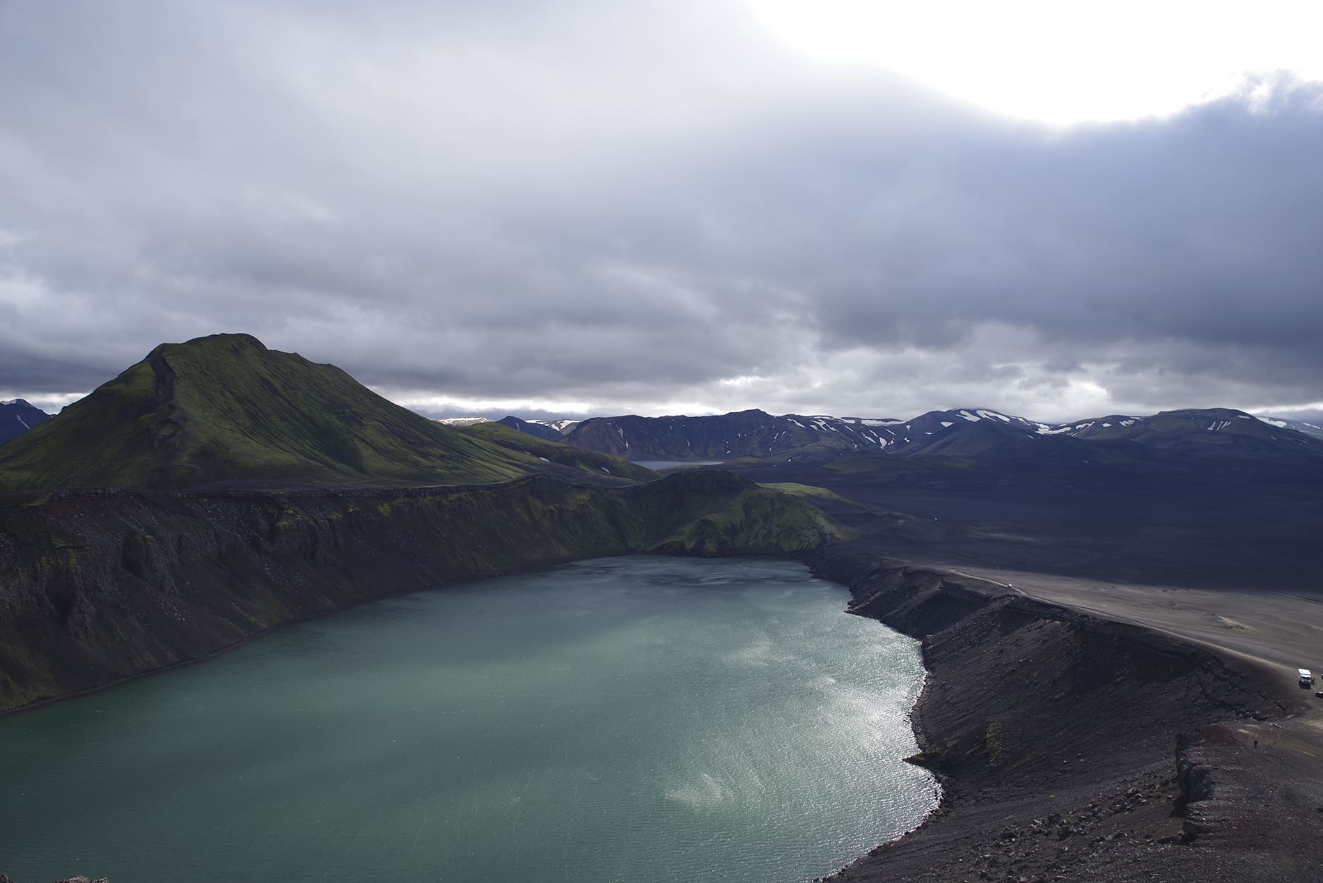 As planned, we continue on the F26 to the F208 where we enter the Fjallabaki National Park and park for the night at a parking lot at the Crater Lake Hnausapollur.