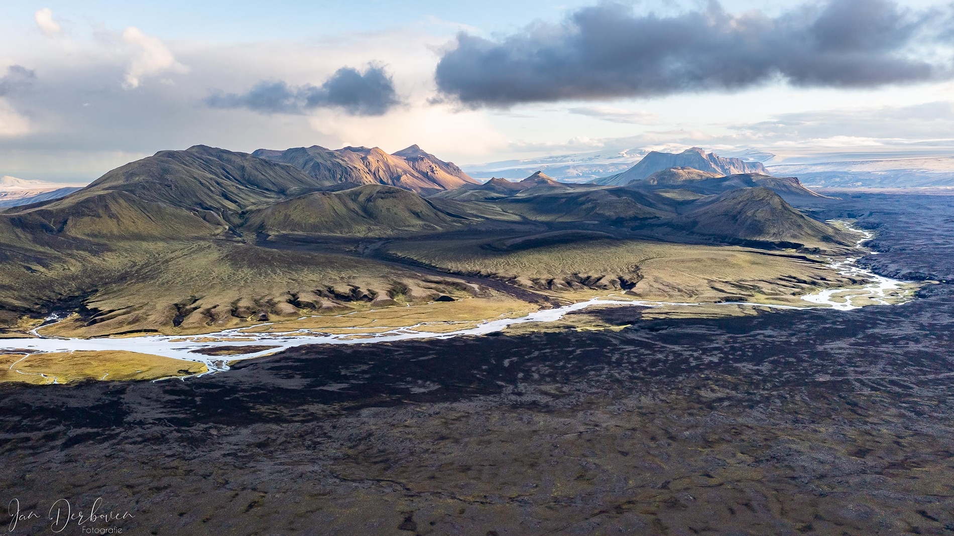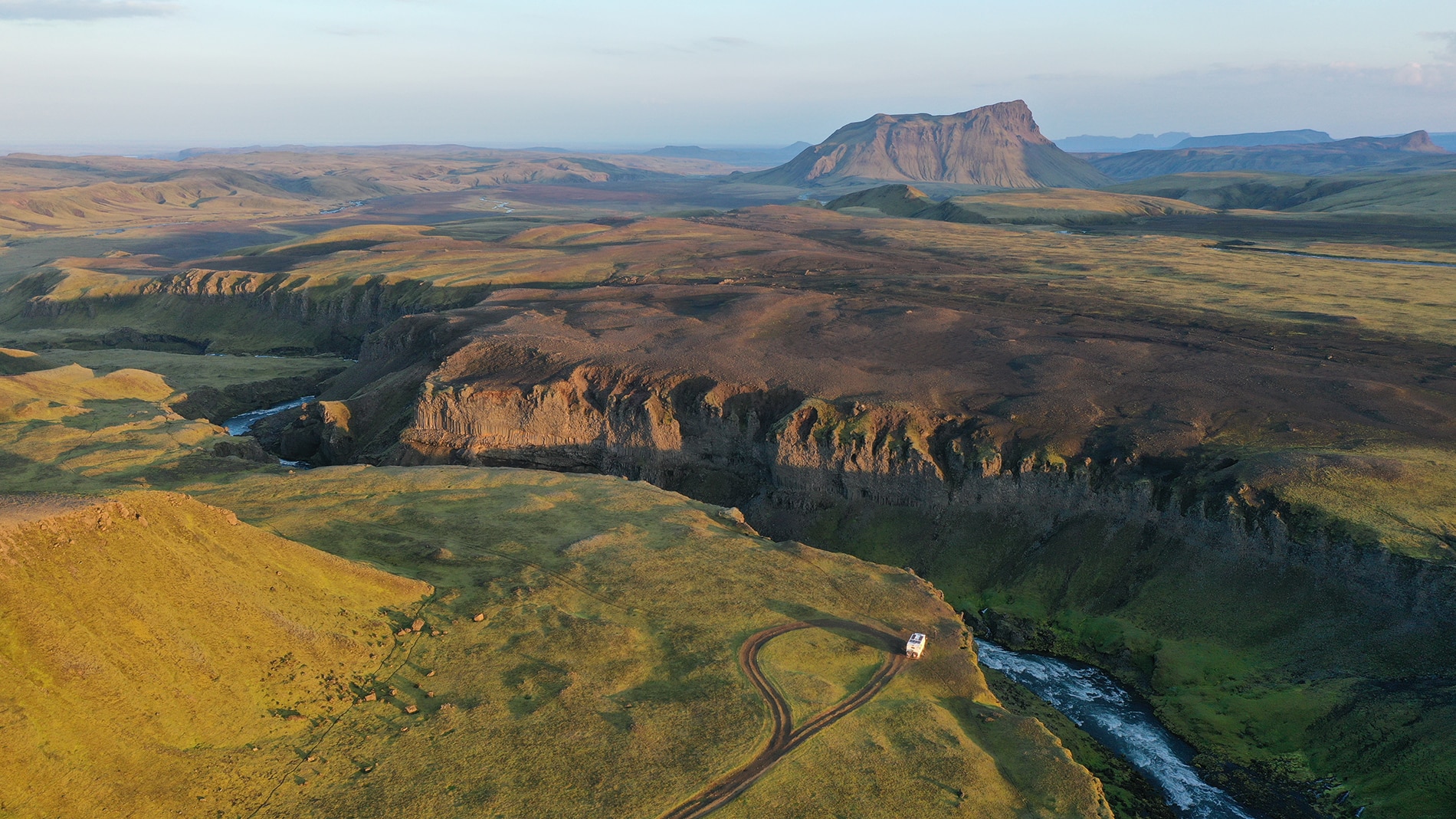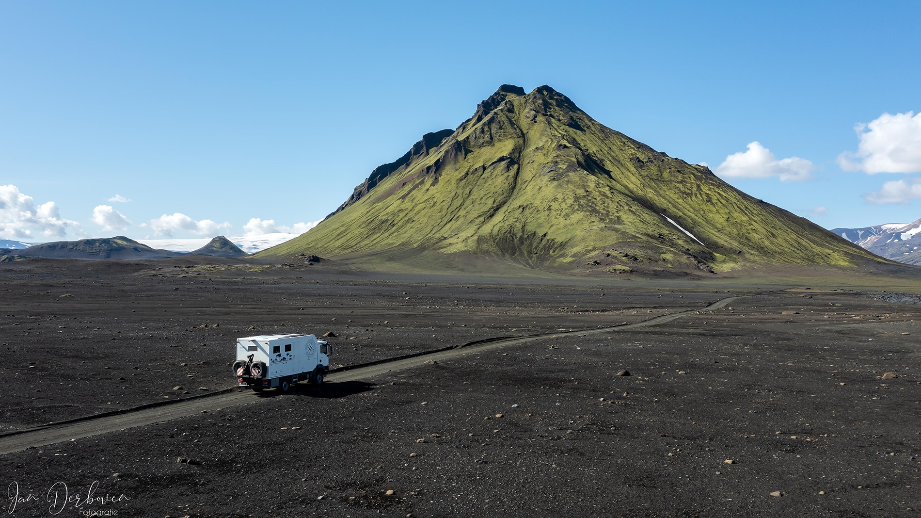 It is early morning, half past five out of bed, outside it is 2.6°C. Madam des mobilhomes is also put out of bed, as we have to drive 8 kilometers to photograph the Maelifell mountain. Well, the disadvantage of nice weather, then it is simply necessary to be on site before the harsh sunlight. Getting up early is rewarded with the soft glow of the awakening sun. Once on site, we simply put bakkie on the side of the track and let the drone do its job. Beautiful and on the other hand it is a shame that we have such a bad summer here in Iceland. It’s all so much more beautiful when the sun shines.
